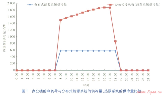 辦公樓在供冷期白天工作時段(8:00—18:00)的平均冷負荷為1650kW,最大冷負荷為1879kW,最小冷負荷為869kW。夜間冷負荷按0kW估算。辦公樓的冷負荷與分布式能源系統(tǒng)的供冷量、熱泵系統(tǒng)的供冷量比較見圖1(熱泵系統(tǒng)的供冷量與冷負荷一致)。