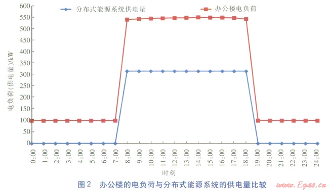 辦公樓白天工作時段(8:00—18:00)的平均電負荷(不包括制冷用電負荷)為546kW,非工作時間內電負荷均按照100kW估算,辦公樓的電負荷與分布式能源系統(tǒng)的供電量比較見圖2。