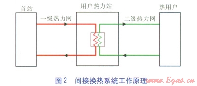 圖2中,一級熱力管網(wǎng)的高溫水和二級熱力管網(wǎng)的低溫水在用戶熱力站經(jīng)過換熱器間接換熱后供給熱用戶。而混水系統(tǒng)中(見圖l),一級熱力管網(wǎng)的高溫水和二級熱力管網(wǎng)的低溫水在用戶熱力站不經(jīng)過換熱器,而是直接混合后供給熱用戶。與間接換熱系統(tǒng)相比,混水系統(tǒng)更容易因?yàn)樗疁氐耐蝗簧叨a(chǎn)生氣體。