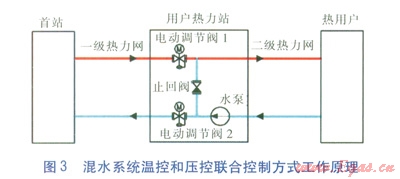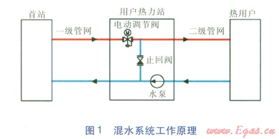 隨著能源和環(huán)境問題日益突出,節(jié)能和環(huán)保引起全球關(guān)注,成為人類社會生存和發(fā)展的兩大主題。混水系統(tǒng)作為一種更加節(jié)能的供熱方案,得到了日益廣泛的應(yīng)用。混水系統(tǒng)工作原理見圖1,將一級管網(wǎng)的高溫水和二級管網(wǎng)的低溫水在用戶熱力站不經(jīng)過換熱器按比例直接混合后供給熱用戶。