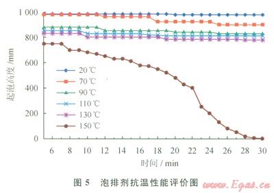 在蒸餾水中加入0.3%的泡排劑,置于油浴鍋中在不同溫度下老化,測(cè)量泡排劑在不同時(shí)間的起泡高度變化,實(shí)驗(yàn)結(jié)果如圖5所示。