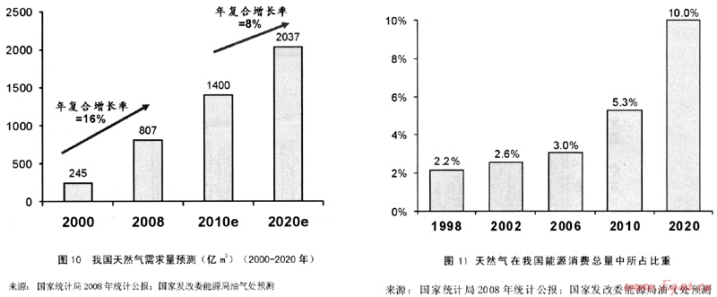 綜上所述,我國天然氣行業(yè)未來幾年仍將保持高速增長。國家發(fā)改委能源局油氣處預(yù)測未來天然氣需求仍將保持快速增長,2010年天然氣需求將達(dá)到1400億m3,2020年將達(dá)到2037億m3,2010年至2020年復(fù)合增長率達(dá)到8%(見圖10)。此外,天然氣在中國能源消費總量構(gòu)成中的占比逐年提高,預(yù)計到2010年將達(dá)到5.3%,到2020年將達(dá)到10%(見圖11)。
