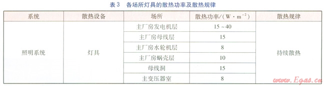 水電站廠房?jī)?nèi)燈具一般使用熒光燈。燈具的散熱來源主要是電阻熱效應(yīng),通過對(duì)流及輻射方式將熱量傳到廠房空間。