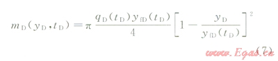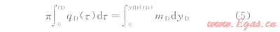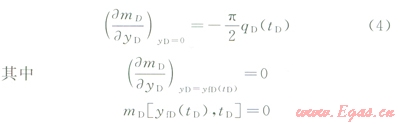 由于探測(cè)邊界yfD隨時(shí)間而變化,直接求解(2)~(4)并非易事,這里采用近似求解方法。首先對(duì)控制方程(2)兩側(cè)先后關(guān)于空間變量(yD)和時(shí)間變量(tD)進(jìn)行積分,利用邊界條件將偏微分方程式(2)轉(zhuǎn)化為探測(cè)邊界內(nèi)物質(zhì)平衡方程: