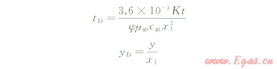 式中K為滲透率,mD;h為地層厚度,m;j為地層孔隙度;mg為氣體黏度,mPa·s;Bg為氣體體積系數(shù);cg為氣體壓縮系數(shù),Mpa-1;Zg為氣體偏差因子;T為地層溫度,K;y為空間坐標(biāo),m;yf為動(dòng)邊界空間位置,m;xf為裂縫半長(zhǎng),m;qsc為氣井產(chǎn)量,m3/d;qref為參考產(chǎn)量,m3/d;Gp為累積產(chǎn)量,m3;p為地層壓力,MPa;t為生產(chǎn)時(shí)間,h;下標(biāo)sc為標(biāo)準(zhǔn)狀態(tài),psc=0.1MPa,Tsc=293.15K;下標(biāo)i為地層原始狀態(tài);下標(biāo)D為無(wú)量綱量。