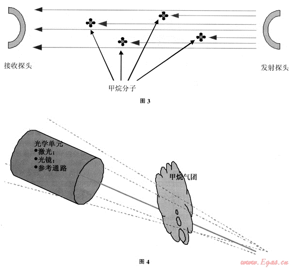 SELMA發(fā)射激光束(1.65μm-近紅外光):激光遇到物體后,漫反射光被光學(xué)單元內(nèi)的拋物柱面鏡所收集,當激光遇到甲烷氣團。激光的能量被甲烷氣團吸收成為甲烷氣團的能量組成部分;較少的激光被反射回光學(xué)單元,使接收到的激光信號減弱;這種減弱會被專用軟件所處理。利用激光對甲烷具有極好的選擇性,收集激光在甲烷氣團中的散射光,通過軟件的算法,實現(xiàn)甲烷的濃度峰值的計算,同時避免了其它碳氫化合物的干擾。如汽車尾氣等。見圖4。