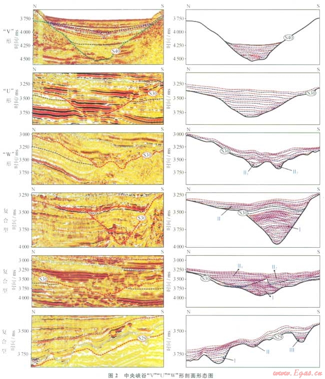 瓊東南盆地經(jīng)歷了由陸到海的地質(zhì)演化過程,期間伴隨發(fā)育有多種類型的儲集體:水道砂、低位扇、海底扇、生物礁、濱海砂壩、三角洲、古潛山等。其中以中新世黃流期發(fā)育于整個深水區(qū)中央坳陷帶內(nèi)的中央峽谷水道砂儲集體,特征最明顯。中央峽谷西起鶯歌海盆地東部陸坡,向東終止于南海西北次海盆,總長度425km,寬度最大處為48.5km。其整體呈SWNE走向,平面上呈“S”形展布,并具有分段性特征,由西至東可劃分為樂東段、陵水段、松南寶島段和長昌段(1),剖面上呈對稱或不對稱的“V”“U”“W”形態(tài)[6-7](2)。受多種地質(zhì)因素的共同控制,中央峽谷內(nèi)部充填結構具有“多期次性”。充填了相互疊置的多套有利的砂泥巖儲蓋組合,并依靠峽谷邊界側封和巖性尖滅形成多個構造+巖性圈閉,具有極大的勘探潛力。