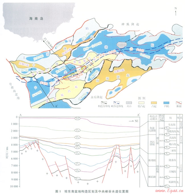 瓊東南盆地位于中國南海北部大陸邊緣,為新生代斷陷坳陷盆地。具有準被動大陸邊緣盆地構造特征,平面上則表現(xiàn)為南北分帶特征,由北至南可劃分為:北部坳陷、中部隆起、中央坳陷與南部隆起(1)。甕地經(jīng)歷由陸到海的演化過程,經(jīng)歷了斷陷期(T100T70)、斷坳期(T70T60)、熱沉降期(T60T30)、加速沉降期(T30現(xiàn)今)4個階段,整體可劃分為裂陷期(T100T60)與裂后期(T60現(xiàn)今)兩個時期,其絕對地質(zhì)年代如圖1所示,沉積巨厚的新生代地層,厚度大于12000m[1-3]。