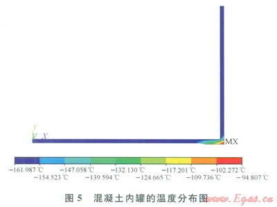 在正常運(yùn)行條件下,LNG蒸發(fā)氣與LNG共存,LNG儲(chǔ)罐的環(huán)境溫度在-162℃附近,由ANSYS模擬可確定,對(duì)于0.8m厚的罐壁,穩(wěn)定后內(nèi)罐外表面的溫度在-159℃附近。內(nèi)罐整體被凍透,所以不考慮凍融的影響。內(nèi)罐底板與罐壁的溫度分布如圖5示。