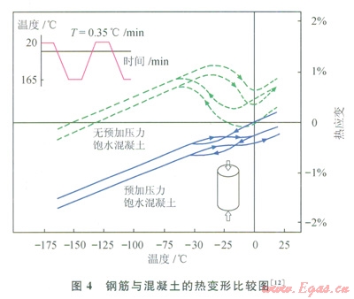 在檢修、維護(hù)的情況下,混凝土內(nèi)罐的局部溫度會(huì)有所升高,混凝土?xí)艿絻鋈谘h(huán)的影響。凍融循環(huán)試驗(yàn)表明[8]:在凍融循環(huán)的情況下,鋼筋與混凝土的黏結(jié)強(qiáng)度、混凝土的強(qiáng)度隨凍融循環(huán)次數(shù)的增加而降低,且高含水量的混凝土受影響較大,減小混凝土中的含水量是降低凍融循環(huán)損害的有效途徑。圖4為鋼筋與混凝土的熱變形比較圖。從圖4以看出,在預(yù)加壓力下,混凝土與鋼筋的熱膨脹系數(shù)接近,且呈線性變化,所以對(duì)混凝土施加預(yù)應(yīng)力,可有效提高鋼筋與混凝土的黏結(jié)性能,提高混凝土耐久性[12];快速有效的檢修、維護(hù)方案、管理制度也是降低凍融損害的有效辦法。