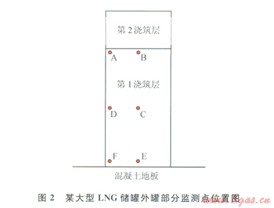 以山東某液化天然氣接收站的一個(gè)160000m3大型LNG儲(chǔ)罐混凝土外罐為例進(jìn)行數(shù)值計(jì)算,混凝土外罐內(nèi)徑為41m,外徑為41.8m,壁厚為0.8m,高為41.1m?;炷镣夤薹?/span>ll層進(jìn)行澆筑,其中1~9層澆筑高度為4m,第l0層澆筑高度為l.5m,第ll層環(huán)梁澆筑高度為2.6m,模板采用20mm膠合板,相鄰施工層時(shí)間間隔為4d。由于結(jié)構(gòu)的對(duì)稱性,取罐壁的四分之一(相鄰扶壁柱之間部分)進(jìn)行有限元分析(圖1),外墻地板采用固定端約束,由于扶壁柱對(duì)外墻的約束,在其兩側(cè)面上施加對(duì)稱彈性約束。監(jiān)測(cè)點(diǎn)分布位置如圖2所示。