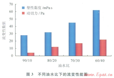 通過測試高密度不同油水比條件下鉆井液的流變性能,優(yōu)選了高密度條件下無土相油基鉆井液的最佳油水比范圍(3)。
