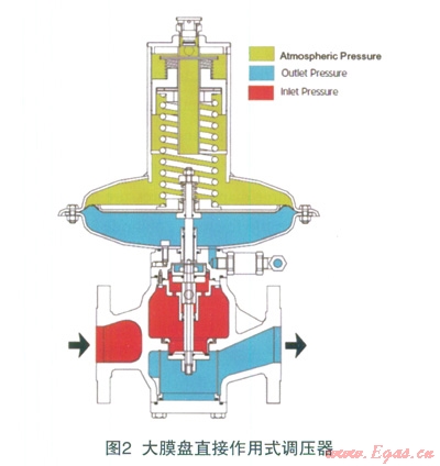該款調(diào)壓器為某進(jìn)口品牌,在我公司大量使用,其質(zhì)量和性能較為穩(wěn)定,一直沒(méi)有出現(xiàn)過(guò)問(wèn)題。該款調(diào)壓器為大膜盤(pán)直接作用式調(diào)壓器,其連接口徑DN80,膜盤(pán)頭部直徑為書(shū)600,其結(jié)構(gòu)型式平衡閥芯式調(diào)壓器,閥瓣位于閥座下部,是典型的失效開(kāi)啟型調(diào)壓器,在主皮膜破裂或壓力信號(hào)管無(wú)壓力反饋時(shí),閥口處于開(kāi)啟狀態(tài)。大膜盤(pán)調(diào)壓器的特點(diǎn)是結(jié)構(gòu)簡(jiǎn)單、響應(yīng)迅速、關(guān)閉精度高,由于大膜盤(pán)的作用,其關(guān)閉精度很高,當(dāng)下游壓力高于設(shè)定值時(shí),閥口關(guān)閉密封性好,無(wú)流量泄漏。其結(jié)構(gòu)見(jiàn)圖2