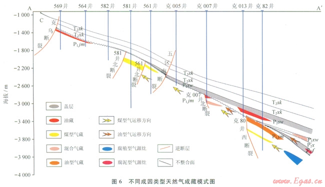 在區(qū)域向東傾斜的背景下,佳木河組頂部不整合面之下的風(fēng)化黏土層構(gòu)成了有效封閉,其下的半風(fēng)化巖石是二疊系油氣重要的側(cè)向運移通道。統(tǒng)計結(jié)果表明,距離不整合面越近,儲集層物性越好,有油氣顯示的層數(shù)越多。風(fēng)城組生成的油型氣一方面受自身烴源巖的封隔作用,另外一方面由于烴源巖的演化階段未完全進入生氣階段,使得油型氣主要分布在風(fēng)城組尖滅線以內(nèi)。而佳木河組氣源巖生成的煤型氣大量沿著這套半風(fēng)化巖石發(fā)生長距離的側(cè)向運移(圖6),大范圍分布在斜坡外緣。煤型氣與油型氣之間則分布了混源氣。輸導(dǎo)斷層相比遮擋型斷層,其發(fā)育規(guī)模更大,歷史上經(jīng)歷了多期活動,垂向上斷穿至白堊系,平面上主要分布于西北緣斜坡外環(huán)的克拉瑪依一烏夏斷裂、紅山嘴斷裂等,主要對早期生成并運移至此的原油及油型氣起到縱向調(diào)節(jié)作用[21]。