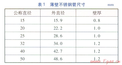 薄壁不銹鋼管材、管件的材料牌號及化學成分應符合GB/T l2771—2008《流體輸送用不銹鋼焊接鋼管》(以下簡稱GB/T l2771—2008)、GB/T19228.1—2011《不銹鋼卡壓式管件組件第l部分卡壓式管件》(以下簡稱GB/T l9228.1—2011)和GB/T l9228.2—201 1《不銹鋼卡壓式管件組件第2部分 連接用薄壁不銹鋼管》(以下簡稱GB/T19228.2—2011)的規(guī)定,材料牌號為06Crl9Nil0(統(tǒng)一數(shù)字代號為$30408)。根據(jù)外直徑的不同,薄壁不銹鋼管材分為Ⅰ系列和Ⅱ系列兩種規(guī)格,考慮到Ⅰ系列的管材外直徑規(guī)格較多,不易與管件相匹配,故在試點工作中選用Il系列管材與管件。本次試點工作中使用的薄壁不銹鋼管最大公稱直徑為50mm,且選用壁厚較大的管道,推薦使用的薄壁不銹鋼管尺寸見表1。
