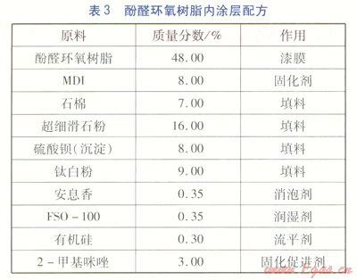 針對天然氣氣源組成、儲氣溫度及壓力提出的酚醛環(huán)氧樹脂內(nèi)涂層配方見表3。