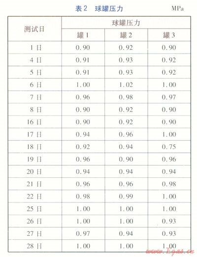 儲氣溫度與壓力是影響球罐內(nèi)鼙腐蝕的環(huán)境因素[2]。球罐儲氣溫度為-10~60℃。2013年2月各測試日3臺球罐的壓力(10:00的數(shù)據(jù))見表2。由表2可知,罐l~3壓力范圍分別為0.90~1.00、0.90~1.02、0.75~1.00MPa。通常,設(shè)計壓力為運(yùn)行壓力的l.2倍,因此在壓力實(shí)驗時選取1.2 MPa作為實(shí)驗壓力。各項實(shí)驗中選取的基材材質(zhì)與球罐罐體內(nèi)壁材質(zhì)一致,涂層平均厚度為175mm。