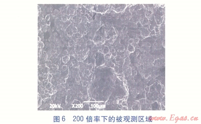 掃描電鏡為JSM—6490LV型掃描電子顯微鏡,采用20kV加速電壓,在真空條件下對壓力實(shí)驗336h后且進(jìn)行交流阻抗實(shí)驗后的涂層進(jìn)行掃描,在放大倍率為200、500的情況下觀察涂層的表面形貌(分別見圖6、7)。由圖6、7可知,被觀測區(qū)域有一個腐蝕形成的不規(guī)則凹坑(顏色較深部分),但腐蝕并不嚴(yán)重。