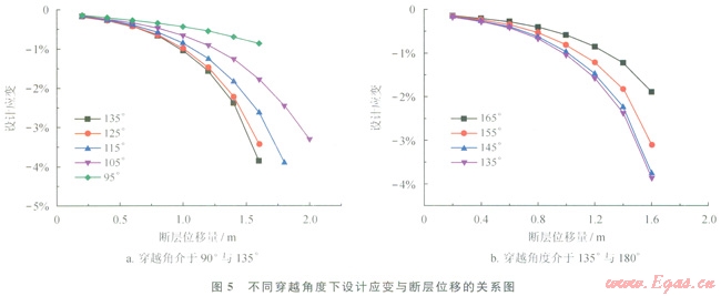 圖5為不同穿越角度下設(shè)計(jì)應(yīng)變與斷層位移的關(guān)系圖,圖5表明,管道的設(shè)計(jì)應(yīng)變?cè)谒写笥?/span>90°的穿越角度下都隨著斷層位移的增大而增大。隨著斷層位移的加大,設(shè)計(jì)應(yīng)變?cè)龃笏俣茸兛?。?dāng)穿越角度小于135°時(shí),角度越大設(shè)計(jì)應(yīng)變?cè)酱?,設(shè)計(jì)應(yīng)變隨斷層位移的變化速度越快;當(dāng)穿越角度大于135°時(shí),角度越大設(shè)計(jì)應(yīng)變?cè)叫。O(shè)計(jì)應(yīng)變隨斷層位移的變化速度越慢。可以得到,在所有穿越角度下,設(shè)計(jì)應(yīng)變與斷層位移均表現(xiàn)為近似冪函數(shù)關(guān)系。