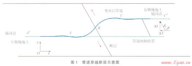 活動(dòng)斷層是地震區(qū)天然氣長(zhǎng)輸管道的主要威脅,斷層作用下管道會(huì)發(fā)生軸向和垂向位移,導(dǎo)致管道內(nèi)產(chǎn)生較大的應(yīng)變而失效。所以斷層作用下管道應(yīng)變的準(zhǔn)確計(jì)算對(duì)斷層區(qū)管道的設(shè)計(jì)與安全評(píng)估具有重要意義。國(guó)內(nèi)外大量學(xué)者針對(duì)斷層區(qū)管道的應(yīng)力應(yīng)變分析進(jìn)行了大量研究[1-12],提出了多種理論和數(shù)值計(jì)算方法,其中在工程中應(yīng)用最廣泛的為Newmark-Hall和Kennedy方法[3-4],但是其只能求解管道穿越角小于90°時(shí)的管道受拉情況,無(wú)法求解管道穿越角大于90°時(shí)管道的受壓情況。