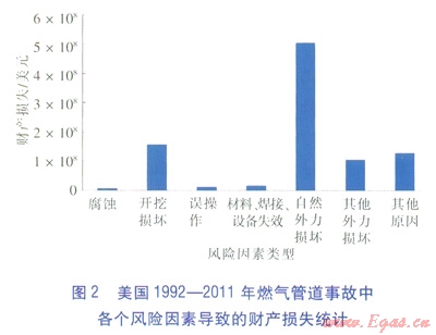 2顯示了美國19922011年燃氣管道事故中各個風(fēng)險因素導(dǎo)致的財產(chǎn)損失統(tǒng)計,其中,自然外力損壞類事故造成財產(chǎn)損失最多,為5.06×108美元;腐蝕類事故造成的財產(chǎn)損失最小,為914.2×104美元。