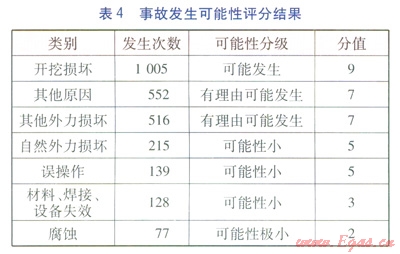 根據(jù)表1、圖1、2中的統(tǒng)計數(shù)據(jù),按照表23中制定的準(zhǔn)則進行評分,通過式(1)計算城市燃氣管道風(fēng)險因素等級。事故發(fā)生可能性評分結(jié)果見表4,事故后果評分結(jié)果見表5。