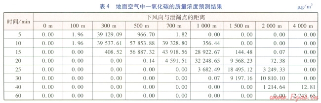 泄漏條件:一氧化碳的泄漏質(zhì)量流量為0.76kg/s,泄漏持續(xù)時間為10min,泄漏點高度為3m,每10s釋放一個煙團(tuán)。氣象條件:風(fēng)速為1.8m/s,大氣穩(wěn)定度為D級。采用多煙團(tuán)模式預(yù)測方式的預(yù)測結(jié)果見表4。根據(jù)預(yù)測結(jié)果,可分析不同時刻下風(fēng)向地面空氣中一氧化碳質(zhì)量濃度超標(biāo)距離范圍。