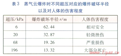 以建筑物破壞程度作為基準(zhǔn),超壓選取不同建筑物破壞程度對應(yīng)的超壓最小值(并進(jìn)行圓整),由式(1)、(2)計算壓縮機房泄漏焦?fàn)t煤氣發(fā)生蒸氣云爆炸時,不同超壓對應(yīng)的爆炸破壞半徑,并判定對人體傷害程度,見表3。