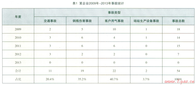 搞好安全管理的前提是進(jìn)行風(fēng)險(xiǎn)分析。根據(jù)企業(yè)的具體特點(diǎn),對(duì)全企業(yè)進(jìn)行全面而系統(tǒng)的安全風(fēng)險(xiǎn)分析,按照現(xiàn)代系統(tǒng)安全工程的觀點(diǎn),安全生產(chǎn)工作是為了使生產(chǎn)過程符合物質(zhì)條件和工作秩序,防止發(fā)生人身傷亡和財(cái)產(chǎn)損失的活動(dòng),安全牛產(chǎn)工作的主要目標(biāo)是使系統(tǒng)中的人員免遭不可承受風(fēng)險(xiǎn)的傷害。安全管理工作實(shí)際上就是風(fēng)險(xiǎn)管理工作。各崗位的危險(xiǎn)程度用危險(xiǎn)度來表示,它是由事故發(fā)生的可能性和事故后果的嚴(yán)重性決定的。經(jīng)過對(duì)國有瓶裝氣企業(yè)進(jìn)行安全風(fēng)險(xiǎn)陛分析,我們得出最常見的安全風(fēng)險(xiǎn)主要有交通安全風(fēng)險(xiǎn)、鋼瓶傷害風(fēng)險(xiǎn)、場站安全風(fēng)險(xiǎn)、客戶用氣事故風(fēng)險(xiǎn)等等,這與國有瓶裝氣企業(yè)歷年安全事故統(tǒng)計(jì)相吻合,某企業(yè)2009年~2013年事故統(tǒng)計(jì)見表1。