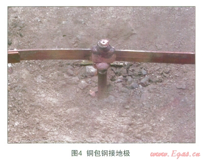 根據(jù)GB/T 50235—2010《工業(yè)金屬管道工程施工及驗收規(guī)范》中對防靜電和防雷電的要求,對于露空的閥門、閘井中的閥門應(yīng)該進(jìn)行接地處理。在接地時,為了有效地降低與土壤的接觸電阻和接地材料的自身腐蝕,往往會使用銅包鋼或者銅網(wǎng)等惰性材料接地方式,如圖4所示。