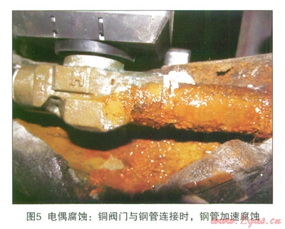 在金屬活動順序表中,Fe要比Cu活潑,在相同的環(huán)境中,Fe的電位要比Cu負(fù)。當(dāng)異種金屬相接觸,處于相互連通的電解質(zhì)中時,由于不同金屬之間存在實際電位差而使電位較低的金屬腐蝕速度比原來增大,電位較高的金屬的腐蝕速度減小,這種現(xiàn)象稱為電偶腐蝕[4],見圖5所示。當(dāng)鋼與銅相互接觸時,鋼的腐蝕速率比其單獨存在時加大。在閥門位置,利用銅包鋼或者銅網(wǎng)進(jìn)行接地時,由于電偶腐蝕的作用,會加速閥門的腐蝕。同時由于銅的良好導(dǎo)電性和自腐蝕較低的特性,利用銅材質(zhì)進(jìn)行接地時,接觸電阻要比閥門直接接地更低,在這種情況下,陰極保護(hù)電流集中流入流出的現(xiàn)象會更加嚴(yán)重。