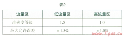 (3)取高、低流量區(qū)中示值誤差絕對(duì)值最大的值作為加氣機(jī)的示值誤差。準(zhǔn)確度等級(jí)應(yīng)符合表2要求。