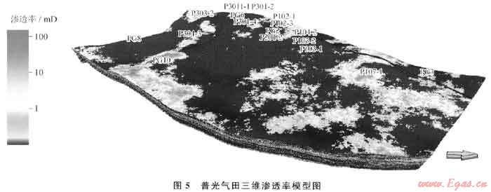 普光氣田儲(chǔ)集空間類型多樣,以孔隙為主,局部發(fā)育裂縫??紫抖群蜐B透率的關(guān)系受多種因素的控制,相關(guān)性不好。為此,在建立滲透率模型時(shí)分兩步進(jìn)行:①由于儲(chǔ)層孔隙類型不同導(dǎo)致孔隙度與滲透率關(guān)系多樣化,在計(jì)算滲透率模型時(shí),首先通過單井測井曲線聲波與密度的相對(duì)幅度差判斷孔隙結(jié)構(gòu)類型,按照不同孔隙結(jié)構(gòu)類型的孔滲關(guān)系式,由各井測井孔隙度計(jì)算出單井各層面不同孔隙類型的滲透率;②由于裂縫的存在,孔隙度變化不大,而滲透率卻成倍增大,因而在對(duì)滲透率模型計(jì)算時(shí)引入裂縫指數(shù)數(shù)據(jù)體對(duì)滲透率進(jìn)行裂縫校正。