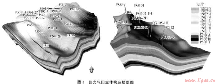 普光地區(qū)儲(chǔ)層屬于碳酸鹽巖礁灘相沉積,針對(duì)儲(chǔ)層儲(chǔ)集空間的類型多樣,儲(chǔ)層厚度大、非均質(zhì)性較強(qiáng),存在多套氣水關(guān)系等地質(zhì)特點(diǎn),綜合利用地震、測井及地質(zhì)等資料,在對(duì)儲(chǔ)層主控因素分析的基礎(chǔ)上,根據(jù)確定性建模與隨機(jī)建模相結(jié)合的原則、等時(shí)建模原則、地震數(shù)據(jù)約束建模原則,利用序貫高斯模擬法、克里金模擬法,對(duì)儲(chǔ)層物性空間分布的非均質(zhì)性進(jìn)行了細(xì)致的描述,建立普光氣田主體構(gòu)造儲(chǔ)層模型。