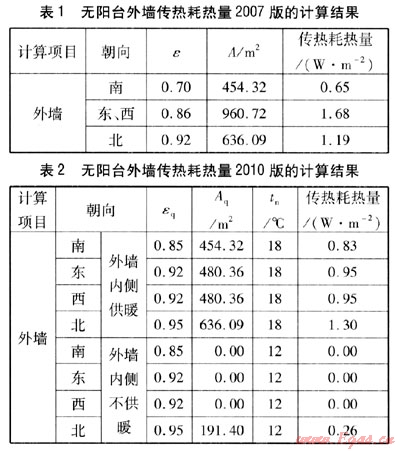 無(wú)陽(yáng)臺(tái)外墻傳熱耗熱量,采用2007版的計(jì)算方法時(shí),由式(2)得到的計(jì)算結(jié)果見表1。采用2010版的計(jì)算方法時(shí),由式(4)得到的計(jì)算結(jié)果見表2。由表1、2可知:2010版的外墻傳熱系數(shù)修正系數(shù)大于2007版。2007版中內(nèi)側(cè)不供暖外墻不參與耗熱量計(jì)算,在內(nèi)側(cè)不供暖外墻耗熱量不參與比較時(shí),2010版計(jì)算得到的外墻傳熱耗熱量為4.03W/m2,仍大于2007版的計(jì)算結(jié)果(3.52W/m2)。由此可知,外墻傳熱系數(shù)修正系數(shù)和供暖室內(nèi)計(jì)算溫度的選取對(duì)于外墻傳熱耗熱量的影響比較大。
