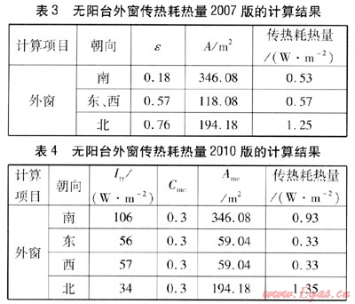 無(wú)陽(yáng)臺(tái)外窗傳熱耗熱量,采用2007版的計(jì)算方法時(shí),由式(2)得到的計(jì)算結(jié)果見表3。采用2010版的計(jì)算方法時(shí),由式(5)、(6)得到的計(jì)算結(jié)果見表4。由表3、4可知,由2010版計(jì)算得到的計(jì)算結(jié)果大于2007版,說明2007版中無(wú)陽(yáng)臺(tái)外窗傳熱耗熱量計(jì)算中采用一個(gè)綜合修正系數(shù)強(qiáng)化了太陽(yáng)輻射得熱對(duì)外窗傳熱耗熱量的影響。