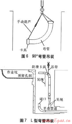 彎管在豎井預(yù)制管吊裝前先行吊裝。吊裝時,為了保證下部焊口基本垂直,采用圖6所示的吊裝方式,通過調(diào)整手動葫蘆的長度來控制彎頭狀態(tài)。