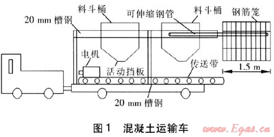 根據(jù)隧道的內(nèi)徑大小,現(xiàn)場制作混凝土運(yùn)輸車,見圖1。受電機(jī)車的運(yùn)載能力和空間限制,運(yùn)輸車一次可運(yùn)輸4m3的混凝土,可澆筑墊層長度為3m;可同時運(yùn)輸鋼筋籠、預(yù)埋件和混凝土,在運(yùn)輸鋼筋籠時伸長可伸縮鋼管,將鋼筋籠掛在上面,鋼筋籠的長度為1.5m,將預(yù)埋件固定在裝滿混凝土的料斗桶內(nèi)?;炷恋拇怪边\(yùn)輸采用起重量為100kN的龍門吊,吊筒采用漏斗型開閉式,容積為1.5~2.0m3?;炷猎谒淼纼?nèi)的水平運(yùn)輸采用牽引力為150kN的軌道電機(jī)車牽引一臺混凝土運(yùn)輸車。