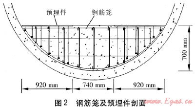 由隧道接收井處向始發(fā)井處進(jìn)行澆筑。當(dāng)混凝土運(yùn)輸車行駛到待澆筑位置時,啟動傳送帶上的電機(jī),打開料斗桶下方的活動擋板,混凝土依靠自重下落到傳送帶上,輸送至待澆筑位置?;炷翝仓r,為保證施工的順利進(jìn)行,需在待澆筑混凝土的正上方設(shè)置鋼支架跳板,跳板需距離混凝土成型面有一定的距離,以保證混凝土正常成型。隧道內(nèi)的混凝土運(yùn)輸時間較長,利用混凝土運(yùn)輸?shù)臅r間進(jìn)行軌道拆除。軌道每段長6m,將拆除的軌道吊掛在隧道壁上。在澆筑混凝土過程中,將預(yù)制好的鋼筋籠和預(yù)埋件安裝好,保證預(yù)埋件上表面水平,且和墊層處于同一水平面,澆筑時要嚴(yán)格按照施工規(guī)范進(jìn)行振搗。混凝土澆筑完成,在收漿后應(yīng)進(jìn)行養(yǎng)護(hù)。養(yǎng)護(hù)期間覆蓋保溫,并保持濕潤,覆蓋時注意不得損傷和污染混凝土表面。在混凝土上面漫鋪草袋,進(jìn)行灑水養(yǎng)護(hù)[2]。鋼筋籠及預(yù)埋件剖面見圖2。