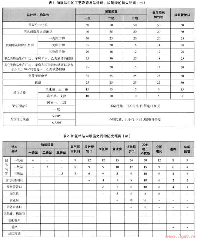 加氫站是甲類火災(zāi)危險(xiǎn)眭設(shè)施,必須在設(shè)計(jì)上保證其安全可靠。在加氫站進(jìn)行站址選擇和站內(nèi)建、構(gòu)筑物及設(shè)備平面布局設(shè)計(jì)時(shí),必須符合上海市城市規(guī)劃和站區(qū)防火安全的要求,參照上海市地方規(guī)范《燃料電池汽車加氫站技術(shù)規(guī)程》,確保加氫站與站外重要公共建筑物、明火或散發(fā)火花地點(diǎn)、民用建筑和廠房、庫房、儲罐、鐵道、鐵路、架空通信線、架空電力線路等保持足夠的防火距離滿足表1的要求。