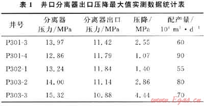 普光氣田開發(fā)井生產后,8臺井口分離器都頻繁出現(xiàn)過出口壓差過大的現(xiàn)象,其中5臺最嚴重,壓降最高時達4.44MPa,井口分離器出口壓降最大值實測數(shù)據(jù)統(tǒng)計表見表1。