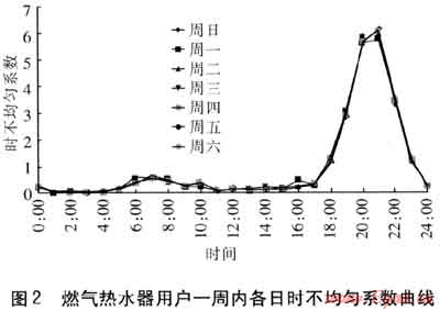 隨著我國(guó)經(jīng)濟(jì)的迅速發(fā)展以及人民生活水平日益提高,人們?cè)谌粘I钪袑?duì)天然氣的需求持續(xù)增長(zhǎng)。天然氣負(fù)荷指標(biāo)和用氣規(guī)律的研究,對(duì)城市燃?xì)庖?guī)劃、設(shè)計(jì)、調(diào)度等具有重要指導(dǎo)意義,近年來(lái)受到廣泛關(guān)注[1~16]。筆者于2010年6月至8月對(duì)北京市燃?xì)鉄崴饔脩暨M(jìn)行調(diào)查,由于燃?xì)鉄崴髦饕糜谙丛?,因此在調(diào)查中著重獲取居民夏季一周內(nèi)各日的洗澡時(shí)間、洗澡耗時(shí),并由此計(jì)算燃?xì)鉄崴饔脷饬?,獲得時(shí)不均勻系數(shù)。以一周為變化周期,分析北京市燃?xì)鉄崴鞯挠脷饬考皶r(shí)不均勻性。