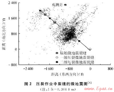 為了增加裂縫和氣層的接觸面積以提高氣井的初始產(chǎn)氣量和采收率,目前一般采用10~20級(jí)的壓裂以增加裂縫的連通。通過井場(chǎng)實(shí)時(shí)微地震來進(jìn)行監(jiān)控(圖2),可以確定井眼東西和南北方向的裂縫頂端的方位,并且隨著壓裂作業(yè)的進(jìn)行而跟蹤裂縫的形成過程。裂縫垂向的延伸具有特別重要的作用,作業(yè)者需要特別關(guān)注確保裂縫沒有延伸到頁巖層之外或者鄰近的水層中去,不然會(huì)使頁巖氣井的經(jīng)濟(jì)效益減少。