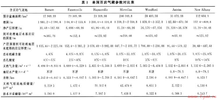 目前發(fā)現(xiàn)的頁巖氣藏主要穿過了南部的48個(gè)州(除阿拉斯加和夏威夷外),最活躍的頁巖氣藏是Barnett、Haynesville、Marcellus、Antrim、Eagle Ford和New Albany等氣藏。表1總結(jié)了美國(guó)優(yōu)選頁巖氣藏的地質(zhì)參數(shù)。表2不僅提供了頁巖氣儲(chǔ)層的地質(zhì)參數(shù),而且給出了通過對(duì)比某些關(guān)鍵參數(shù)評(píng)估頁巖氣盆地的方法。這些參數(shù)也應(yīng)用在頁巖氣井的完井設(shè)計(jì)中。