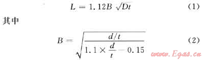當(dāng)腐蝕深度比大于管道壁厚的10%且小于80%的鄰近腐蝕區(qū)域,腐蝕區(qū)的軸向長(zhǎng)度不得大于由下式計(jì)算出的距離: