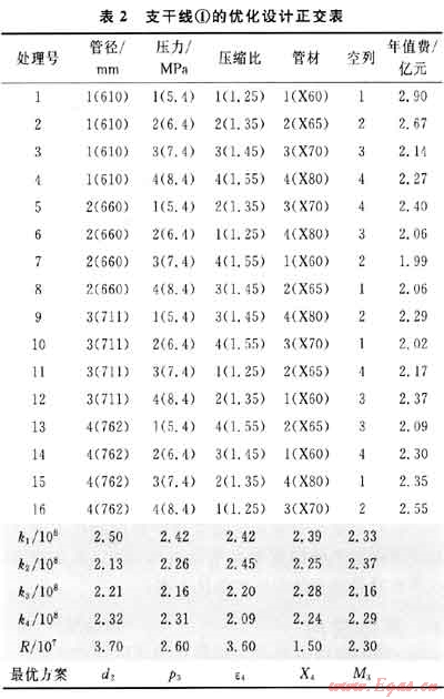 由模型可知,在輸量及輸送距離已定的條件下,長距離輸氣管道的可行管徑、壓力、鋼材級別、壓氣站數(shù)(壓氣站間距、壓縮比)與長距離輸氣管道的營運成本間的關(guān)系是復(fù)雜、甚至是難以辨析清楚的。由于工程技術(shù)條件所限定,上述各變量又皆為離散可列的,所以,在選定管道年值費用作為取舍標準后,采用正交試驗設(shè)計方法,科學(xué)安排各經(jīng)濟參數(shù)的方案組合,能用較少的試驗次數(shù)找出最優(yōu)的方案。