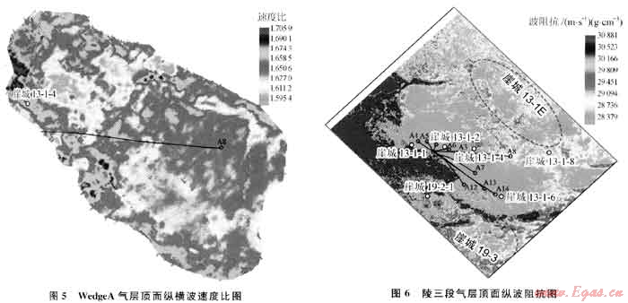 理論計(jì)算、正演模擬和實(shí)際道集分析均表明崖城13-1氣田陵三段氣層具有Ⅳ類AV0特征,那么三亞組和陵三段氣層周邊的勘探目標(biāo)是否也屬Ⅳ類AVO特征呢?三亞組的WedgeA砂體在2000年之前只有崖城13-1-4井鉆遇,鉆遇的地層厚度為111.3m,但氣層厚度只有6m,且物性較差,滲透率只有14mD,之前的地質(zhì)研究成果認(rèn)為該砂體的開發(fā)潛力不大。但是該砂體在地震資料上反射特征清楚,通過對(duì)比追蹤、AV0分析和疊前AV0反演認(rèn)為該砂體具有與陵三段氣層相同的Ⅳ類AVO特征(圖4),從反演得到的WedgeA頂面縱橫波速度比分布圖(圖5)可以看出崖城13-1-4井鉆遇了WedgeA砂體的邊部,相對(duì)整個(gè)砂體來說崖城13-1-4井位置物性較差,而該砂體東部物性變好、含氣性特征更明顯、厚度也變大,通過崖城13-1-4井層速度預(yù)測(cè)砂體A8井處氣層厚度在50m以上,基于上述的地震預(yù)測(cè)結(jié)果決定鉆探A8井。于2000年在崖城13-1-4井東邊鉆探了A8井,在該砂體鉆遇氣層厚度達(dá)65.2m,滲透率高達(dá)1600mD、日產(chǎn)氣150×104m3,是目前該氣田產(chǎn)量最高的井之一,從而證實(shí)了鉆前的地震預(yù)測(cè)結(jié)果。