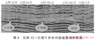 元壩地區(qū)長興組某方向的地震剖面(圖4)顯示地震相特征主要表現(xiàn)為臺地邊緣淺灘相、臺地邊緣生物礁相及礁前斜坡相,與測井相所反映的沉積特征一致。臺地邊緣生物礁為“低頻、弱振幅、內(nèi)部雜亂、透鏡狀反射結(jié)構(gòu)”地震相特征[7],一般外形上頂部上拱隆起形成披蓋構(gòu)造和側(cè)面上超形態(tài),呈丘狀,這與臺地邊緣生物礁沉積體的“含弱反射的隆起”特征類似,為典型生物礁沉積特征,如元壩102、元壩101井區(qū)地震相沉積特征。臺地邊緣淺灘,常發(fā)育碎屑灘,這些碎屑顆粒往往是由海浪拍打生物礁形成的,地震剖面上呈“斷續(xù)、斜交、中強(qiáng)振幅反射”的地震相特征,如元壩12、元壩11井井區(qū)為礁后淺灘沉積特征。臺地邊緣往陸棚過渡,水動力條件逐漸減弱,巖性泥質(zhì)含量增多,反射波組呈平行、亞平行反射,并有同相軸增多現(xiàn)象,如元壩5井井區(qū)為礁前斜坡沉積特征。
