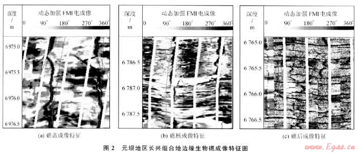 研究區(qū)大部分井都已取全取準(zhǔn)了成像測井資料,利用成像測井對元壩地區(qū)長興組礁灘相儲層的沉積微相做進(jìn)一步刻畫顯得尤為重要。通過對本區(qū)鉆井的成像測井信息與沉積微相的地質(zhì)信息進(jìn)行對比分析表明,礁蓋、礁核是最有利于元壩長興組礁灘相優(yōu)質(zhì)儲層發(fā)育的沉積微相。