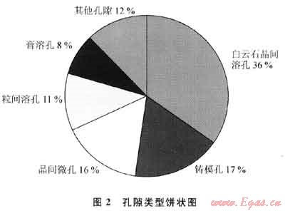 根據(jù)巖心鑄體薄片、電鏡掃描分析,Asmari組孔隙類型豐富多樣,以次生孔隙為主;原生孔隙極少,在成巖作用過程中幾乎破壞殆盡??紫吨饕獮橥砥谌芪g作用形成的白云石晶間溶孔、粒屑鑄???、粒間及粒內(nèi)溶孔、膏溶孔或膏???。其中,白云石晶間溶孔,生屑、砂屑等碳酸鹽巖粒屑被溶蝕或選擇性溶蝕形成的鑄???、粒內(nèi)或粒間溶孔以及膏溶孔等,分別占各類孔隙的36%;白云石、少量方解石的晶間微孔占16%;粒間孔、粒內(nèi)孔、生屑體腔孔、殼壁孔等原生孔隙以及其他類型的孔隙僅占12%(圖2)。